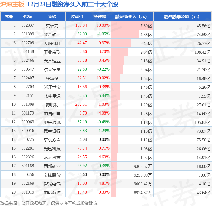 沪深主板融资净买入前三分别为:英维克(002837)融资净买入7.3亿元、紫金矿业(601899)融资净买入4.88亿元、天赐材料(002709)融资净买入3.43亿元,前20具体见下表: