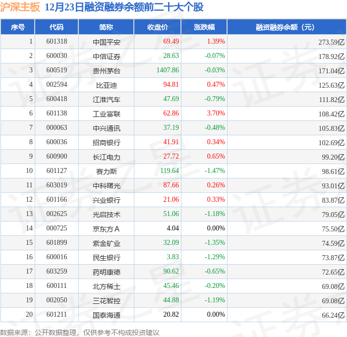 沪深主板融资融券余额前三分别为:中国平安(601318)融资融券余额273.59亿元、中信证券(600030)融资融券余额178.92亿元、贵州茅台(600519)融资融券余额171.04亿元,前20具体见下表: