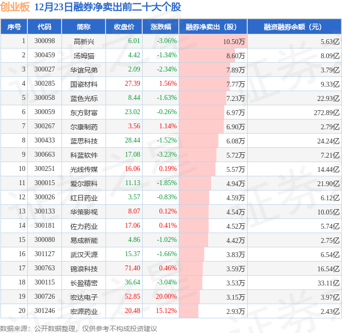 创业板融券净卖出前三分别为:高新兴(300098)融券净卖出10.5万股、汤姆猫(300459)融券净卖出8.6万股、华谊兄弟(300027)融券净卖出7.89万股,前20具体见下表: