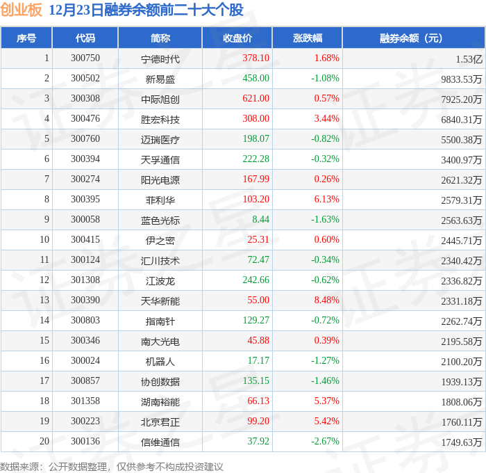 创业板融券余额前三分别为:宁德时代(300750)融券余额1.53亿元、新易盛(300502)融券余额9833.53万元、中际旭创(300308)融券余额7925.2万元,前20具体见下表: