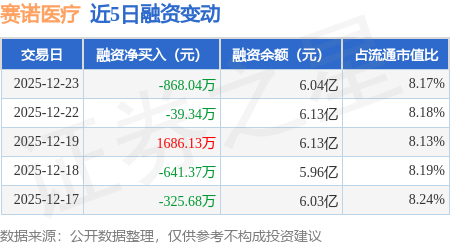 证券之星消息,12月23日,赛诺医疗(688108)融资买入940.68万元,融资偿还1808.72万元,融资净卖出868.04万元,融资余额6.04亿元。