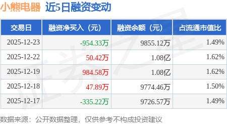 证券之星消息,12月23日,小熊电器(002959)融资买入470.85万元,融资偿还1425.17万元,融资净卖出954.33万元,融资余额9855.12万元。