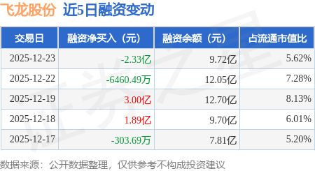 证券之星消息,12月23日,飞龙股份(002536)融资买入5.94亿元,融资偿还8.27亿元,融资净卖出2.33亿元,融资余额9.72亿元。
