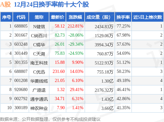 当日A股换手率前10大个股中7只个股收涨,平均涨幅40.0%,其中N健信(688805)以换手率77.25%排第一,7只个股近5个交易日中多次上榜。