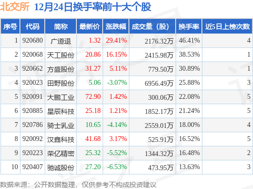 当日北交所换手率前10大个股中6只个股收涨,平均涨幅9.41%,其中广道退(920680)以换手率46.41%排第一,8只个股近5个交易日中多次上榜。