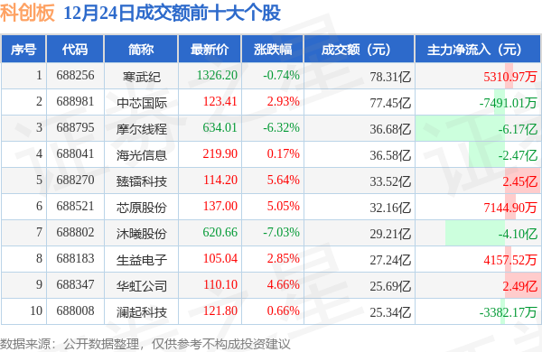 当日科创板成交额前10大个股中7只个股收涨,平均涨幅3.14%,其中寒武纪(688256)以成交额78.31亿元排第一。从主力资金流入看,成交额前10大个股中有5只个股呈现主力资金净流入。