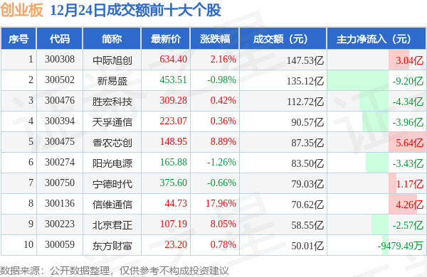 当日创业板成交额前10大个股中7只个股收涨,平均涨幅5.52%,其中中际旭创(300308)以成交额147.53亿元排第一。从主力资金流入看,成交额前10大个股中有4只个股呈现主力资金净流入。