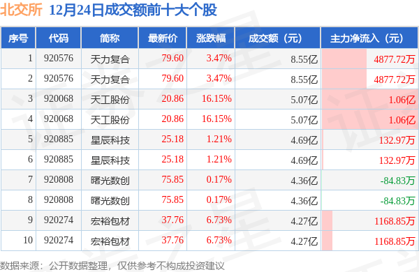当日北交所成交额前10大个股全线收涨,平均涨幅5.55%,其中天力复合(920576)以成交额8.55亿元排第一。从主力资金流入看,成交额前10大个股中有8只个股呈现主力资金净流入。