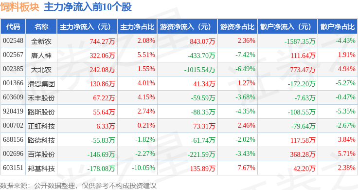 从资金流向上来看,当日饲料板块主力资金净流出9688.29万元,游资资金净流入7717.64万元,散户资金净流入1970.65万元。饲料板块个股资金流向见下表:
