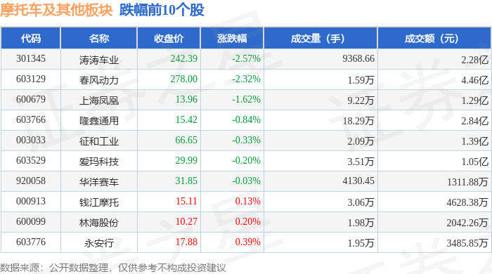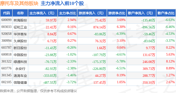 从资金流向上来看,当日摩托车及其他板块主力资金净流出1.34亿元,游资资金净流出827.23万元,散户资金净流入1.42亿元。摩托车及其他板块个股资金流向见下表: