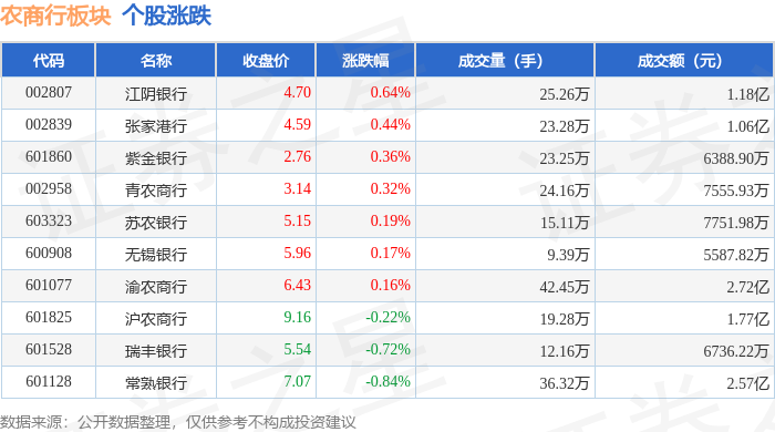 证券之星消息,12月24日农商行板块较上一交易日下跌0.05%,常熟银行领跌。当日上证指数报收于3940.95,上涨0.53%。深证成指报收于13486.42,上涨0.88%。农商行板块个股涨跌见下表: