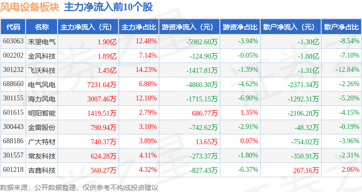 从资金流向上来看,当日风电设备板块主力资金净流入4.48亿元,游资资金净流出2.07亿元,散户资金净流出2.4亿元。风电设备板块个股资金流向见下表: