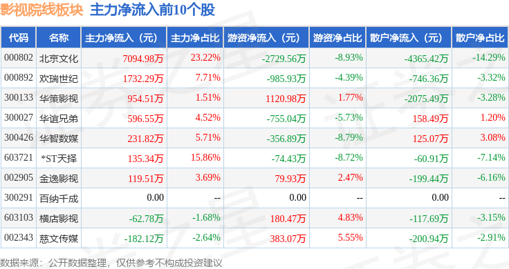 从资金流向上来看,当日影视院线板块主力资金净流出1.22亿元,游资资金净流出790.63万元,散户资金净流入1.3亿元。影视院线板块个股资金流向见下表:
