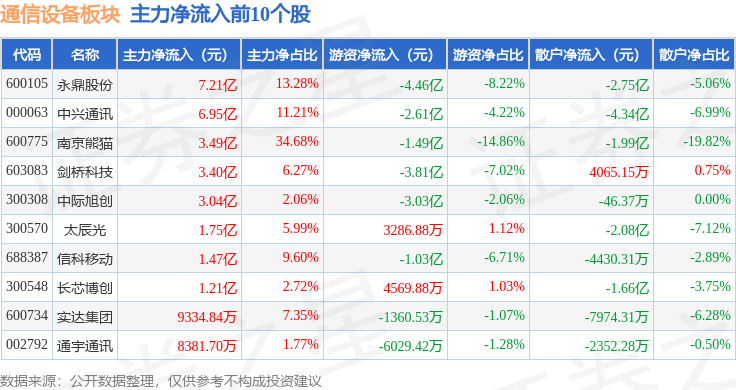 从资金流向上来看,当日通信设备板块主力资金净流入6.77亿元,游资资金净流出6714.8万元,散户资金净流出6.09亿元。通信设备板块个股资金流向见下表:
