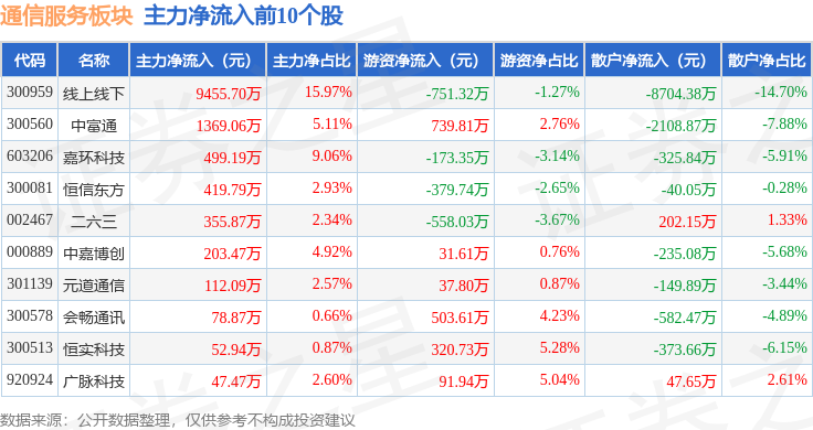 从资金流向上来看,当日通信服务板块主力资金净流出6.18亿元,游资资金净流入1.34亿元,散户资金净流入4.84亿元。通信服务板块个股资金流向见下表: