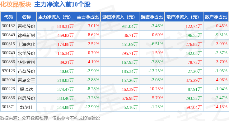 从资金流向上来看,当日化妆品板块主力资金净流出5233.32万元,游资资金净流入491.42万元,散户资金净流入4741.89万元。化妆品板块个股资金流向见下表:
