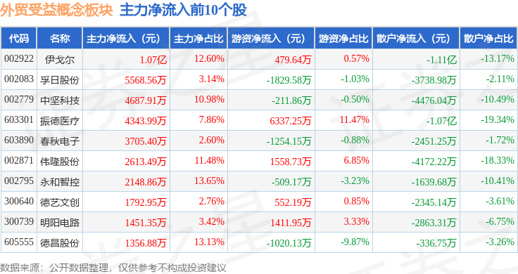 从资金流向上来看,当日外贸受益概念板块主力资金净流出5.9亿元,游资资金净流入2.39亿元,散户资金净流入3.52亿元。外贸受益概念板块个股资金流向见下表:
