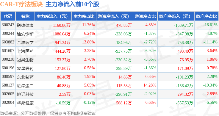 从资金流向上来看,当日CAR-T疗法板块主力资金净流出6.22亿元,游资资金净流入1.39亿元,散户资金净流入4.83亿元。CAR-T疗法板块个股资金流向见下表: