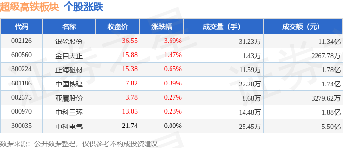 证券之星消息,12月24日超级高铁板块较上一交易日上涨0.93%,银轮股份领涨。当日上证指数报收于3940.95,上涨0.53%。深证成指报收于13486.42,上涨0.88%。超级高铁板块个股涨跌见下表: