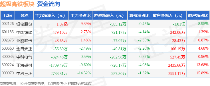 从资金流向上来看,当日超级高铁板块主力资金净流入6354.05万元,游资资金净流出2539.62万元,散户资金净流出3814.44万元。超级高铁板块个股资金流向见下表: