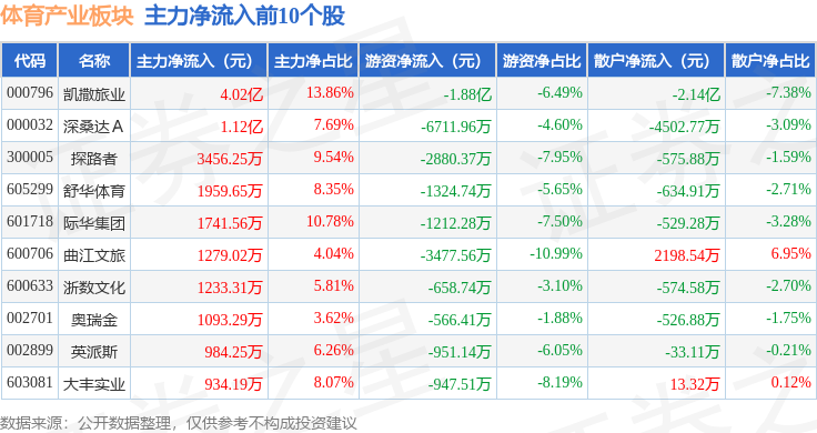 从资金流向上来看,当日体育产业板块主力资金净流入3.77亿元,游资资金净流出4.76亿元,散户资金净流入9902.52万元。体育产业板块个股资金流向见下表: