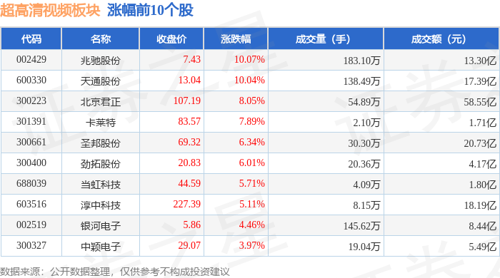 证券之星消息,12月24日超高清视频板块较上一交易日上涨1.41%,兆驰股份领涨。当日上证指数报收于3940.95,上涨0.53%。深证成指报收于13486.42,上涨0.88%。超高清视频板块个股涨跌见下表: