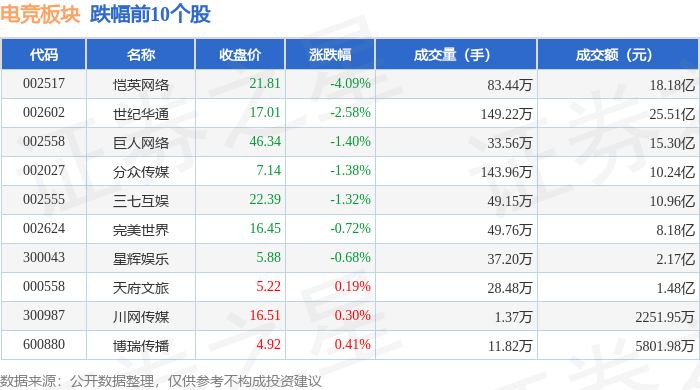 证券之星消息,12月24日电竞板块较上一交易日下跌0.82%,恺英网络领跌。当日上证指数报收于3940.95,上涨0.53%。深证成指报收于13486.42,上涨0.88%。电竞板块个股涨跌见下表: