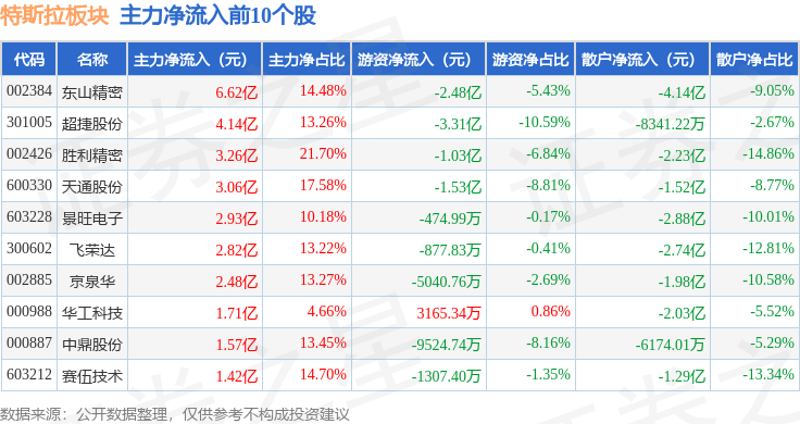 从资金流向上来看,当日特斯拉板块主力资金净流入19.0亿元,游资资金净流出17.11亿元,散户资金净流出1.89亿元。特斯拉板块个股资金流向见下表: