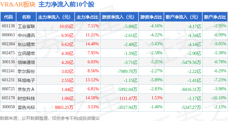 从资金流向上来看,当日VR&AR板块主力资金净流入33.97亿元,游资资金净流出24.16亿元,散户资金净流出9.81亿元。VR&AR板块个股资金流向见下表: