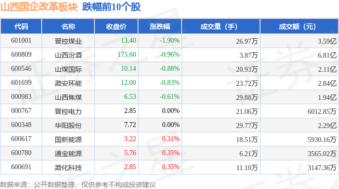 证券之星消息,12月24日山西国企改革板块较上一交易日下跌0.38%,晋控煤业领跌。当日上证指数报收于3940.95,上涨0.53%。深证成指报收于13486.42,上涨0.88%。山西国企改革板块个股涨跌见下表: