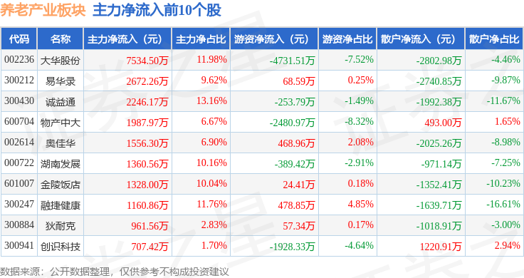 从资金流向上来看,当日养老产业板块主力资金净流出4.16亿元,游资资金净流出1.1亿元,散户资金净流入5.26亿元。养老产业板块个股资金流向见下表: