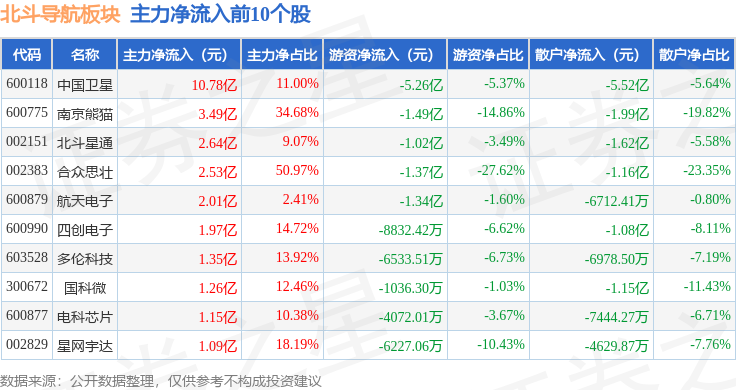 从资金流向上来看,当日北斗导航板块主力资金净流入25.98亿元,游资资金净流出20.59亿元,散户资金净流出5.39亿元。北斗导航板块个股资金流向见下表: