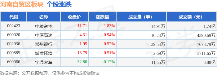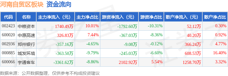从资金流向上来看,当日河南自贸区板块主力资金净流出2014.98万元,游资资金净流出310.82万元,散户资金净流入2325.79万元。河南自贸区板块个股资金流向见下表: