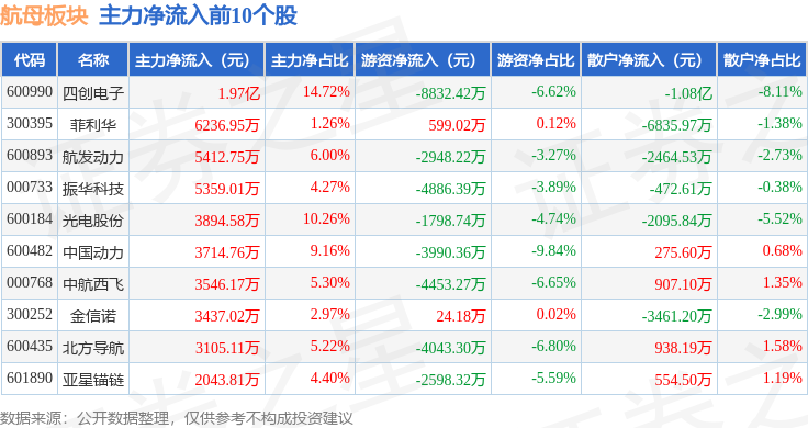 从资金流向上来看,当日航母板块主力资金净流入4.73亿元,游资资金净流出5.53亿元,散户资金净流入8015.56万元。航母板块个股资金流向见下表: