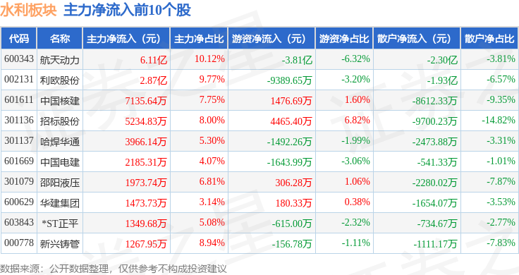 从资金流向上来看,当日水利板块主力资金净流入7.23亿元,游资资金净流出5.11亿元,散户资金净流出2.12亿元。水利板块个股资金流向见下表: