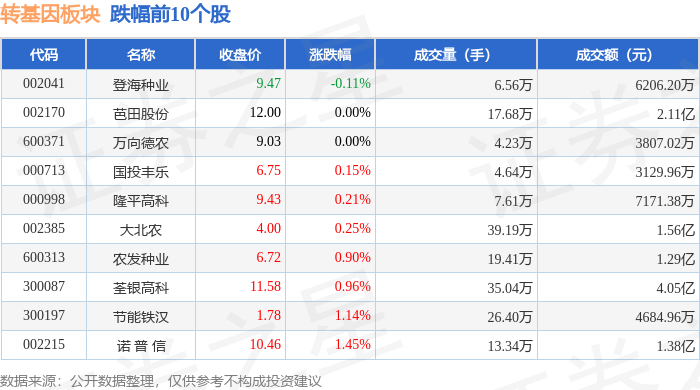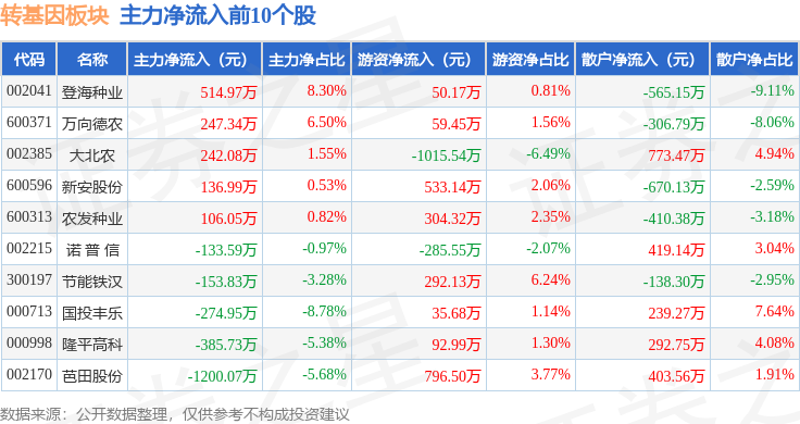 从资金流向上来看,当日转基因板块主力资金净流出6035.63万元,游资资金净流入1951.57万元,散户资金净流入4084.06万元。转基因板块个股资金流向见下表: