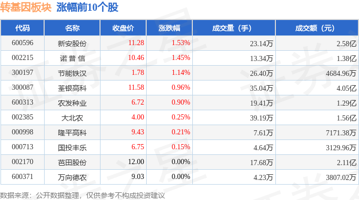 证券之星消息,12月24日转基因板块较上一交易日上涨0.65%,新安股份领涨。当日上证指数报收于3940.95,上涨0.53%。深证成指报收于13486.42,上涨0.88%。转基因板块个股涨跌见下表: