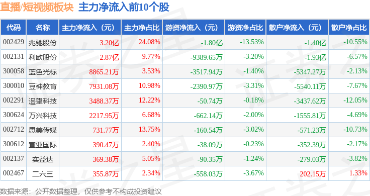 从资金流向上来看,当日直播/短视频板块主力资金净流入6.35亿元,游资资金净流出3.97亿元,散户资金净流出2.38亿元。直播/短视频板块个股资金流向见下表: