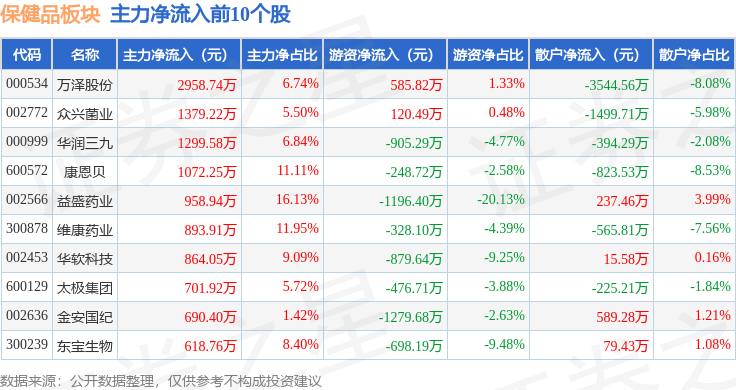 从资金流向上来看,当日保健品板块主力资金净流出9.2亿元,游资资金净流入1.3亿元,散户资金净流入7.9亿元。保健品板块个股资金流向见下表: