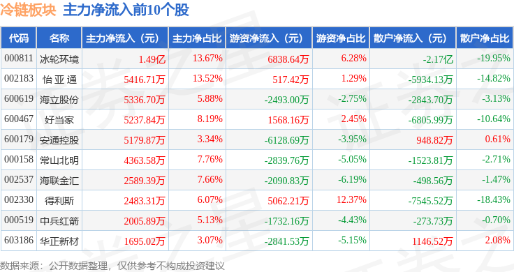 从资金流向上来看,当日冷链板块主力资金净流出4.83亿元,游资资金净流入2.15亿元,散户资金净流入2.67亿元。冷链板块个股资金流向见下表:
