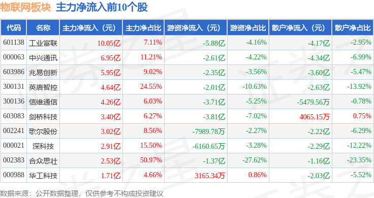 从资金流向上来看,当日物联网板块主力资金净流入33.83亿元,游资资金净流出33.79亿元,散户资金净流出417.58万元。物联网板块个股资金流向见下表: