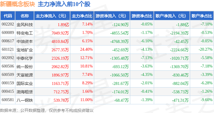从资金流向上来看,当日新疆概念板块主力资金净流入2402.03万元,游资资金净流出1.09亿元,散户资金净流入8469.76万元。新疆概念板块个股资金流向见下表: