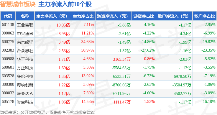 从资金流向上来看,当日智慧城市板块主力资金净流入22.95亿元,游资资金净流出26.97亿元,散户资金净流入4.03亿元。智慧城市板块个股资金流向见下表: