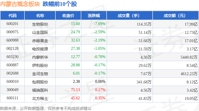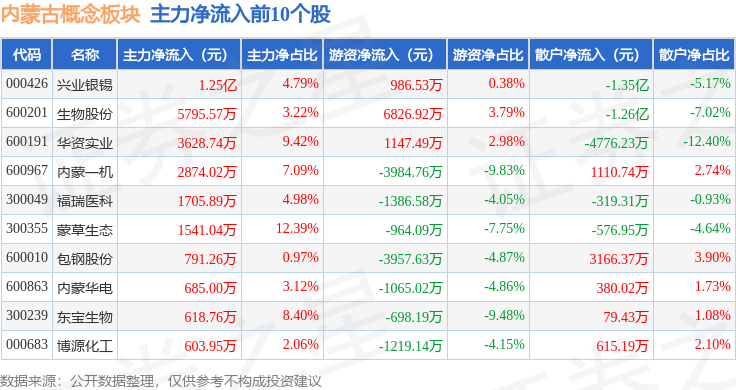 从资金流向上来看,当日内蒙古概念板块主力资金净流出1.13亿元,游资资金净流出6787.45万元,散户资金净流入1.81亿元。内蒙古概念板块个股资金流向见下表: