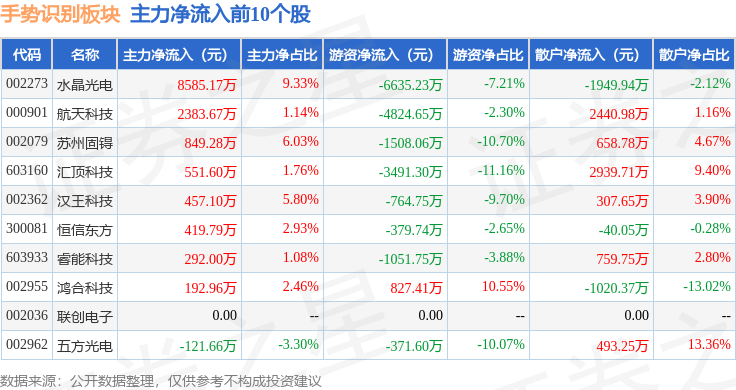 从资金流向上来看,当日手势识别板块主力资金净流出2.66亿元,游资资金净流出2.84亿元,散户资金净流入5.49亿元。手势识别板块个股资金流向见下表: