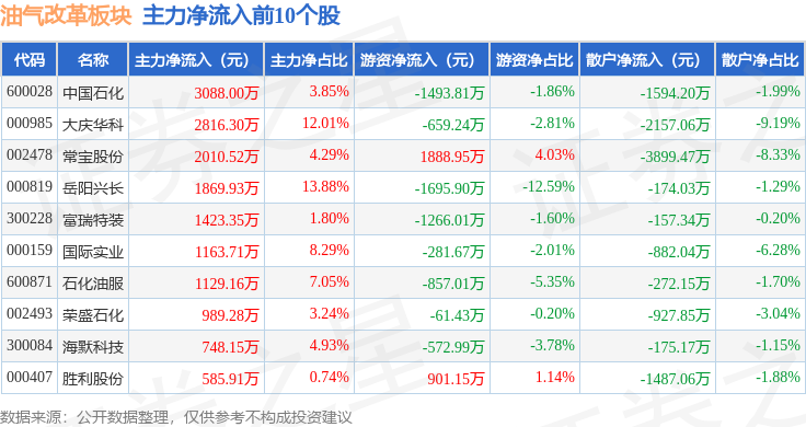 从资金流向上来看,当日油气改革板块主力资金净流出7362.02万元,游资资金净流出2905.05万元,散户资金净流入1.03亿元。油气改革板块个股资金流向见下表: