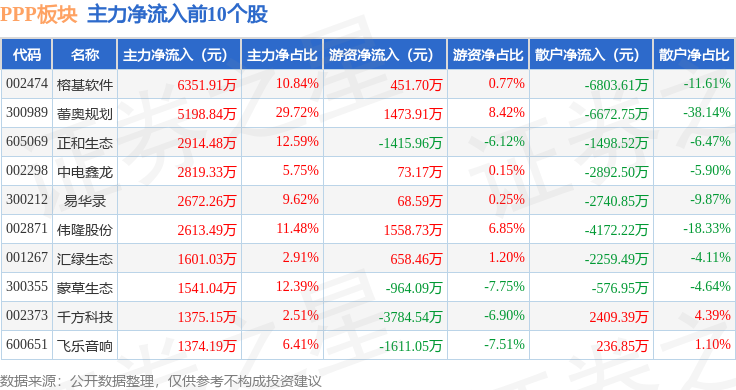 从资金流向上来看,当日PPP板块主力资金净流出6.71亿元,游资资金净流入8293.98万元,散户资金净流入5.89亿元。PPP板块个股资金流向见下表: