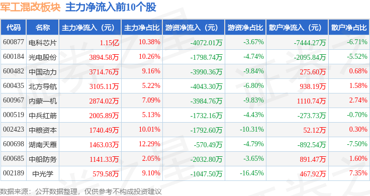 从资金流向上来看,当日军工混改板块主力资金净流出8782.02万元,游资资金净流出3.23亿元,散户资金净流入4.1亿元。军工混改板块个股资金流向见下表: