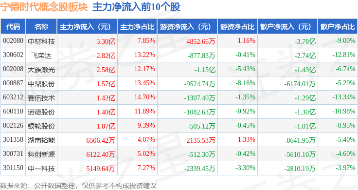 从资金流向上来看,当日宁德时代概念股板块主力资金净流出5.6亿元,游资资金净流出5.89亿元,散户资金净流入11.49亿元。宁德时代概念股板块个股资金流向见下表: