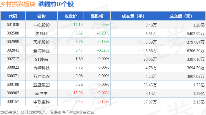从资金流向上来看,当日乡村振兴板块主力资金净流入1.06亿元,游资资金净流出9009.46万元,散户资金净流出1623.81万元。乡村振兴板块个股资金流向见下表: